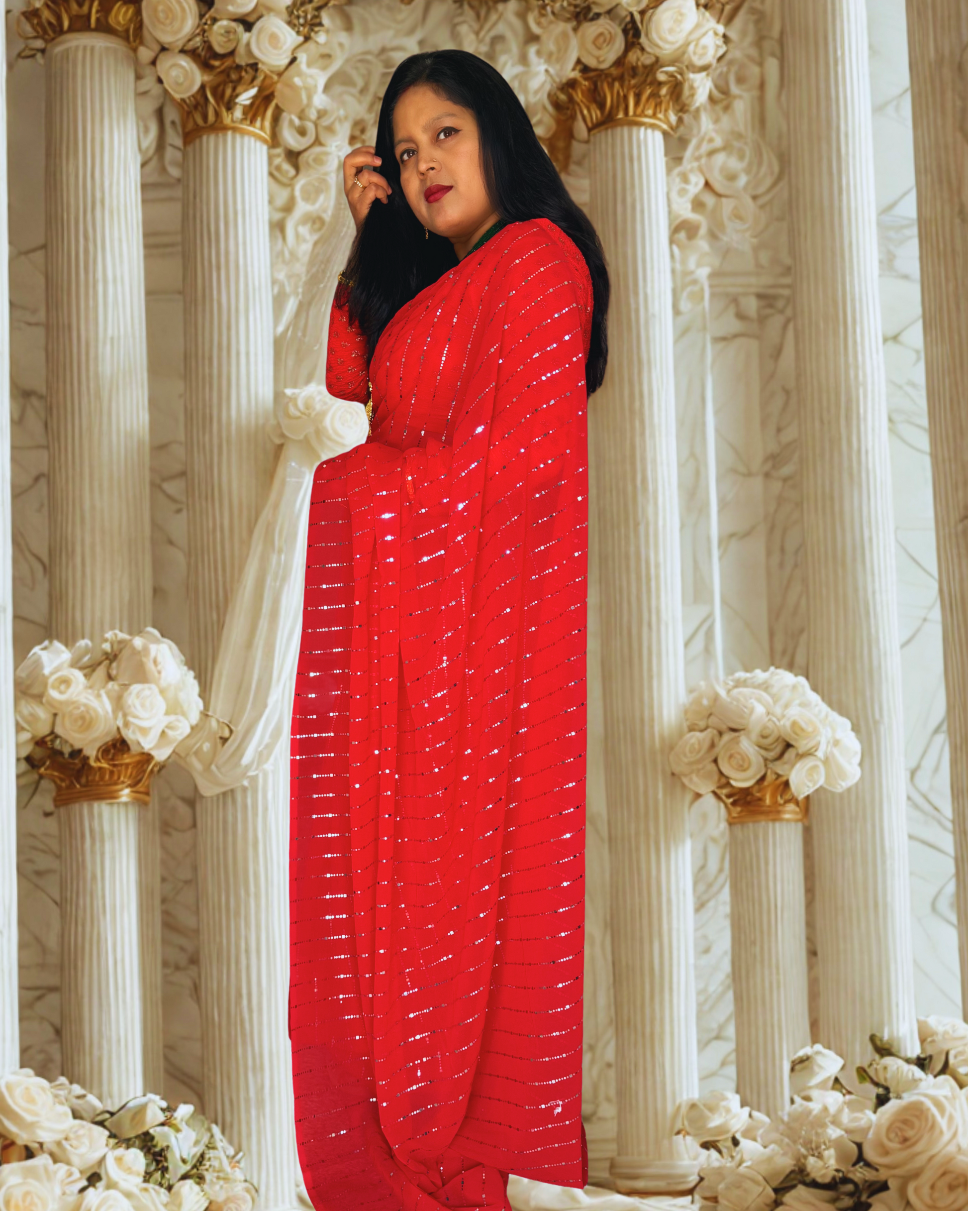 Step into effortless elegance with this Red Sequin Georgette Saree, designed for women who love timeless tradition with a modern sparkle. Made from premium lightweight georgette, this saree is adorned with shimmering silver sequin stripes that catch the light beautifully, making it perfect for weddings, parties, and festive occasions.