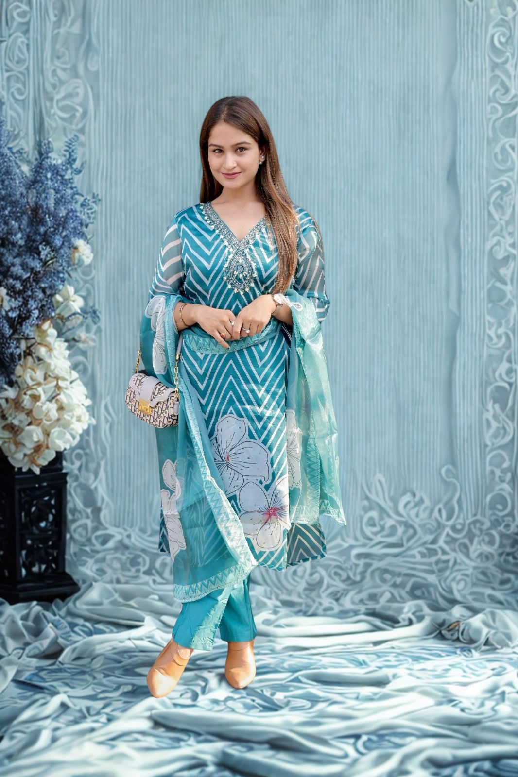 Crafted in a lightweight, breathable fabric, the kurti showcases a chevron-inspired print softened by large hand-drawn florals, evoking the calm beauty of a spring garden. A delicately embellished V-neckline adds a touch of handcrafted charm, while the relaxed silhouette flatters every body type. Coordinating straight pants in a rich tone complete the set, making this outfit your go-to choice for effortless elegance — whether you're heading to a casual brunch or a cozy celebration.